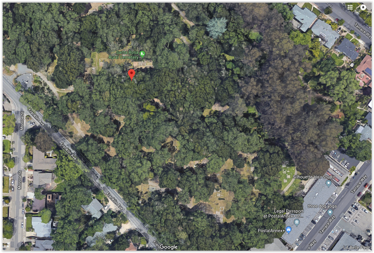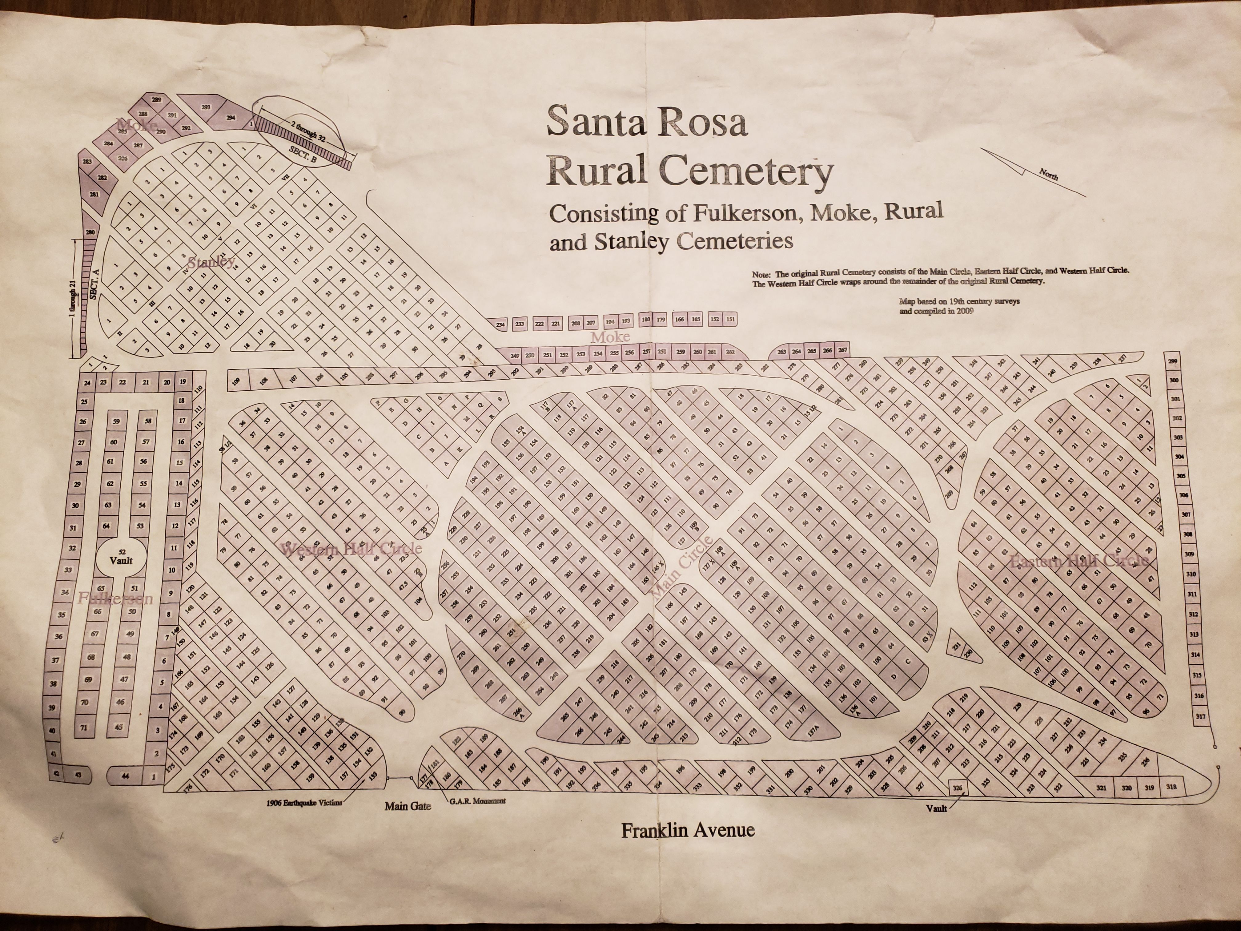 Notes: 1600 Franklin Street Cemetery entrance: Sign: Aerial view: Cemetery map: