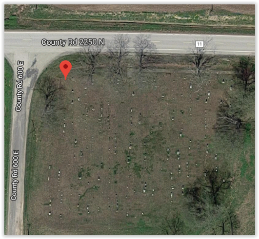Located at the intersection of County Rd. 2250 N. & County Rd. 600 E., and is easily visible from the road.