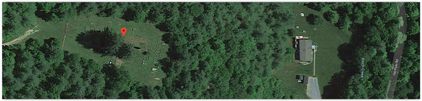 Located in a meadow behind a house and forest, west of Old Pluto Rd. (Pinch Creek Rd.). not far from Pluto Church on Pluto Rd. (27) near its intersection with Pinch Creek Rd. (which becomes Spade Mine Rd.).