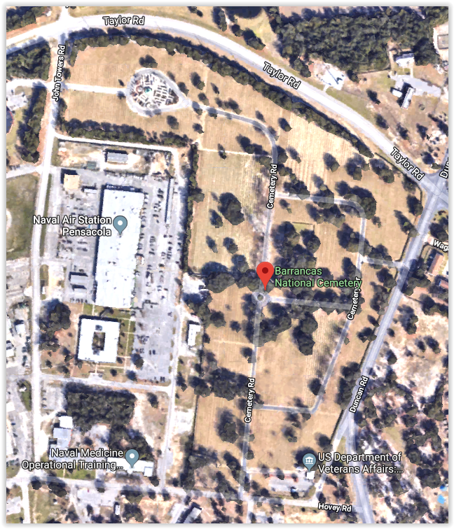 Notes: Next to Naval Air Station at Pensacola, with entrances on Hovey Rd., Duncan Rd. & John Towers Rd. (view fro Taylor Rd.). Sign by entrance: Cemetery map: Aerial view: