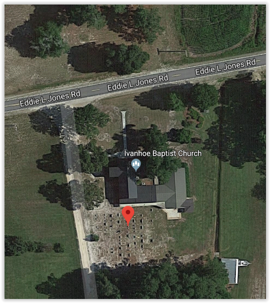 From Harrells take Wildcat Road (SR-1007) go for 4.5 miles. Turn left onto Ivanhoe Road (SR-1100) go for 6.0 miles. Then turn left onto Eddie L. Jones Road (SR-1102) go 0.2 mile. The cemetery will be on the right.
